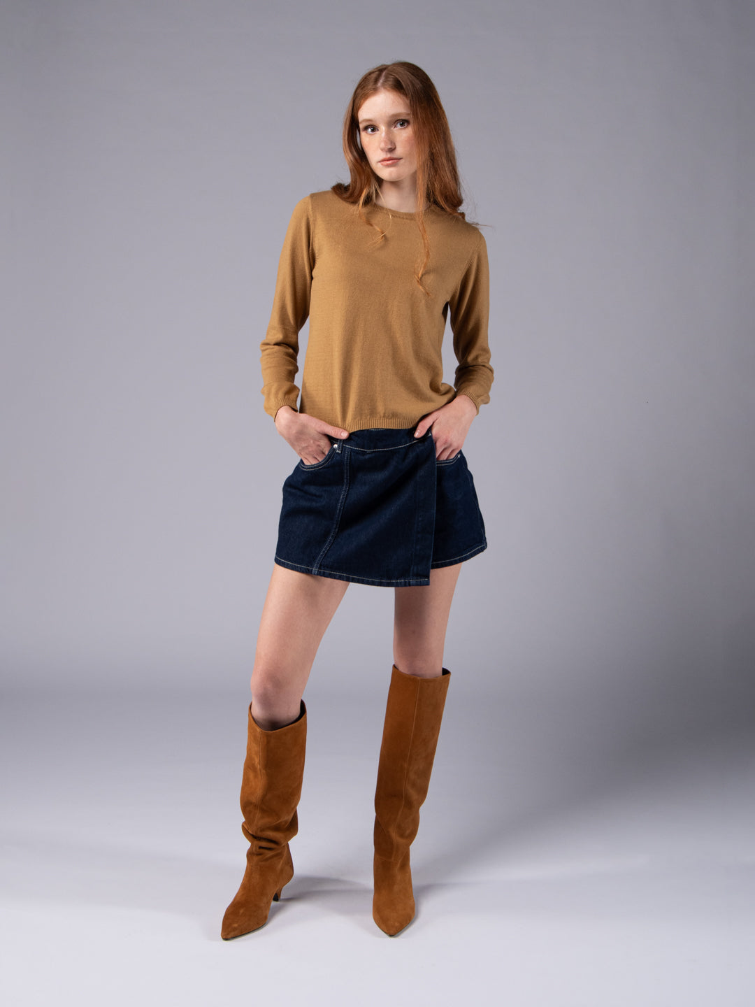 Miel de CamelloEste jersey de cuello redondo en camel miel nace del deseo de crear una prenda esencial que puedas ponerte hoy y volver a ponértela dentro de un año y seguir luciendo impecable. Confeccionado con una mezcla perfecta de lana merina y algodón orgánico italiano, este jersey de punto grueso es el básico atemporal que tu armario se merece. La modelo mide 175 cm, pesa 52 kg y lleva la talla S.