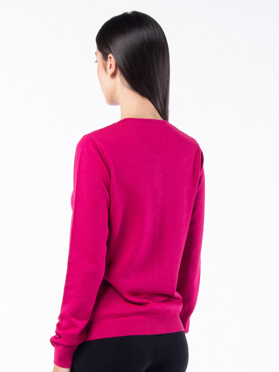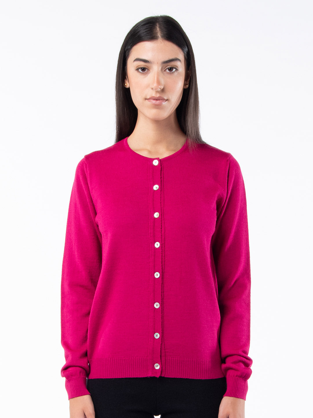 Rosa FuschiaRebeca de cuello redondo con botones de nácar natural en lana merina de alta calidad. Una de las mayores ventajas de la lana merina es su hipoalergenicidad y regulación de la temperatura corporal. Esta lana es naturalmente resistente a los ácaros del polvo y otros alérgenos comunes que pueden desencadenar reacciones alérgicas cutáneas. Resistente y duradera, es una inversión a largo plazo. La modelo mide 174 cm, pesa 54 kg y lleva la talla S.