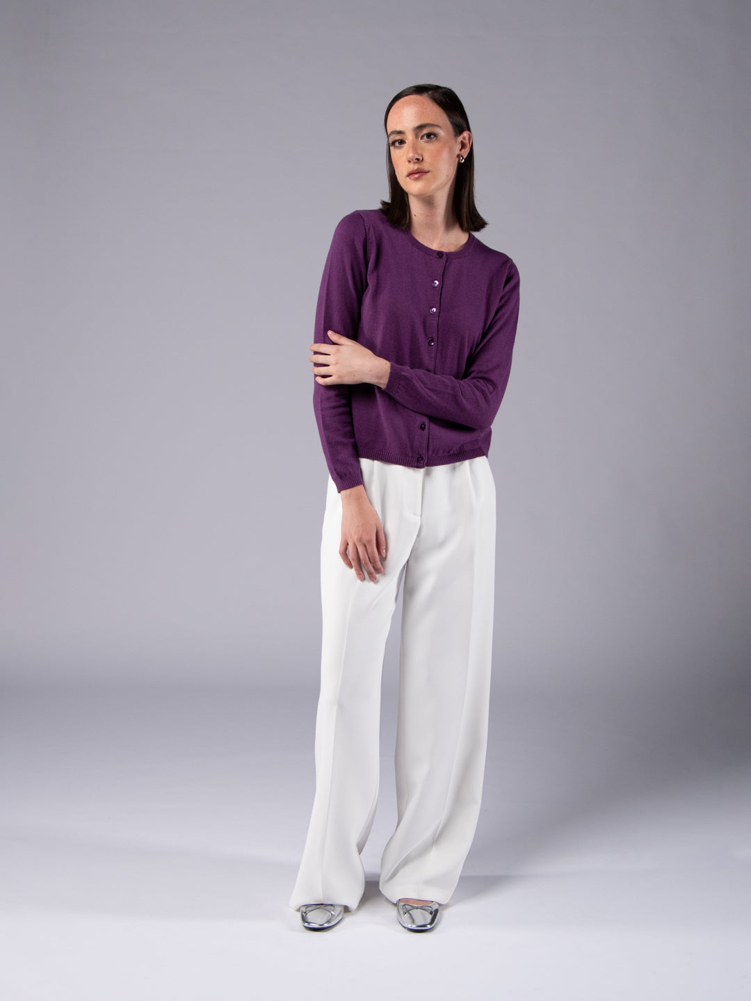 MoradoEste cárdigan de cuello redondo en color morado nació del deseo de crear una pieza esencial que puedas llevar hoy, dentro de un año y seguir luciendo impecable. Confeccionado con una mezcla perfecta de lana merina y algodón orgánico italiano y botones naturales de color nácar, este cárdigan es el básico atemporal que tu armario se merece. La modelo mide 175 cm, pesa 50 kg y lleva la talla S.