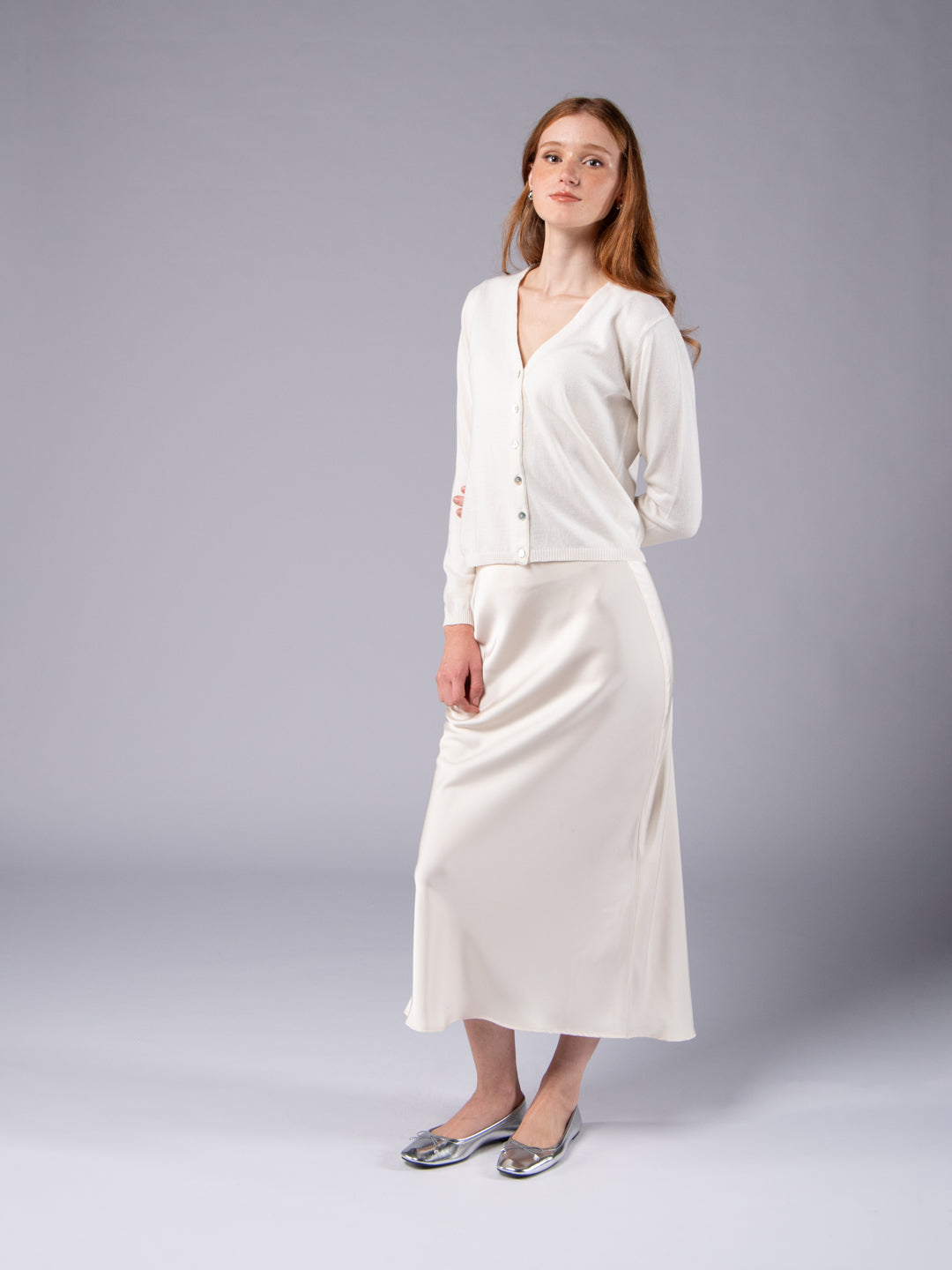 Blanco perlaEste cárdigan blanco perla con cuello en V nació del deseo de crear una pieza esencial que pudieras ponerte hoy, lucir dentro de un año y seguir luciendo impecable. Confeccionado con una mezcla perfecta de lana merina y algodón orgánico italiano y botones naturales de color nácar, este cárdigan es el básico atemporal que tu armario se merece. La modelo mide 175 cm, pesa 50 kg y lleva la talla S.