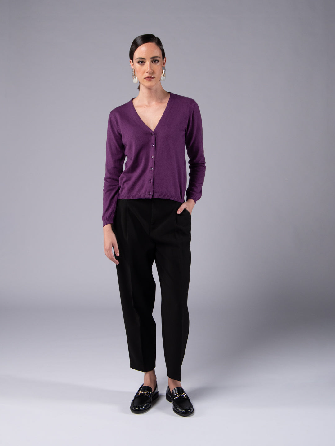 MoradoEste cárdigan morado con cuello de pico nació del deseo de crear una pieza esencial que puedas ponerte hoy, lucir dentro de un año y seguir luciendo impecable. Confeccionado con una mezcla perfecta de lana merina y algodón orgánico italiano y botones naturales de color nácar, este cárdigan es el básico atemporal que tu armario se merece. La modelo mide 175 cm, pesa 52 kg y lleva la talla S.