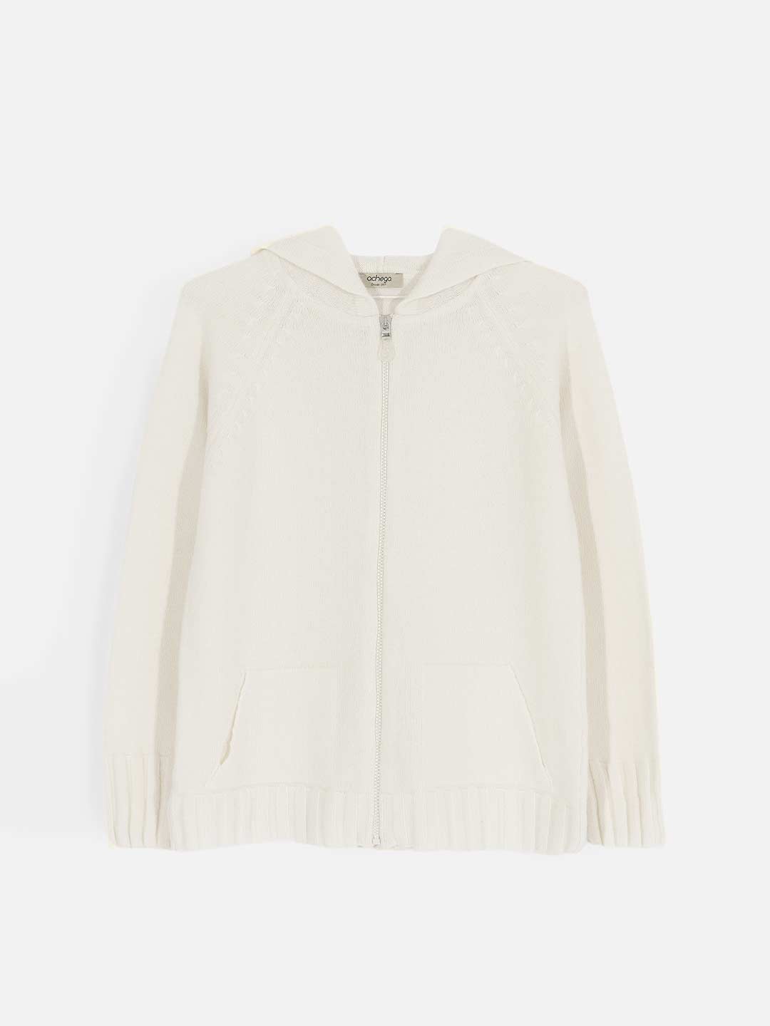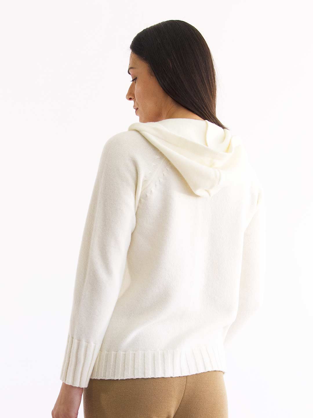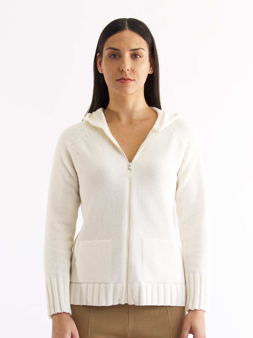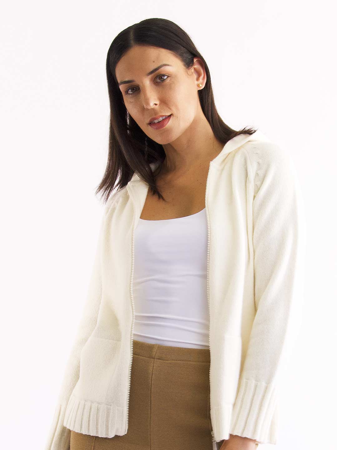 Branco PérolaCasaco em malha com fecho e capuz com punhos e cós canelado em lambswool de alta qualidade. Os bolsos chapados com abertura de lado evocam um estilo mais desportivo e prático. A alta percentagem de lã de ovelha confere-lhe características que só uma matéria prima natural pode oferecer. Leve, quente, confortável e macio, um desportivo, versátil e de alta qualidade. Produzido com fibras italianas esta casaco promete longevidade. A modelo mede 175cm e pesa 63kg, veste o tamanho M