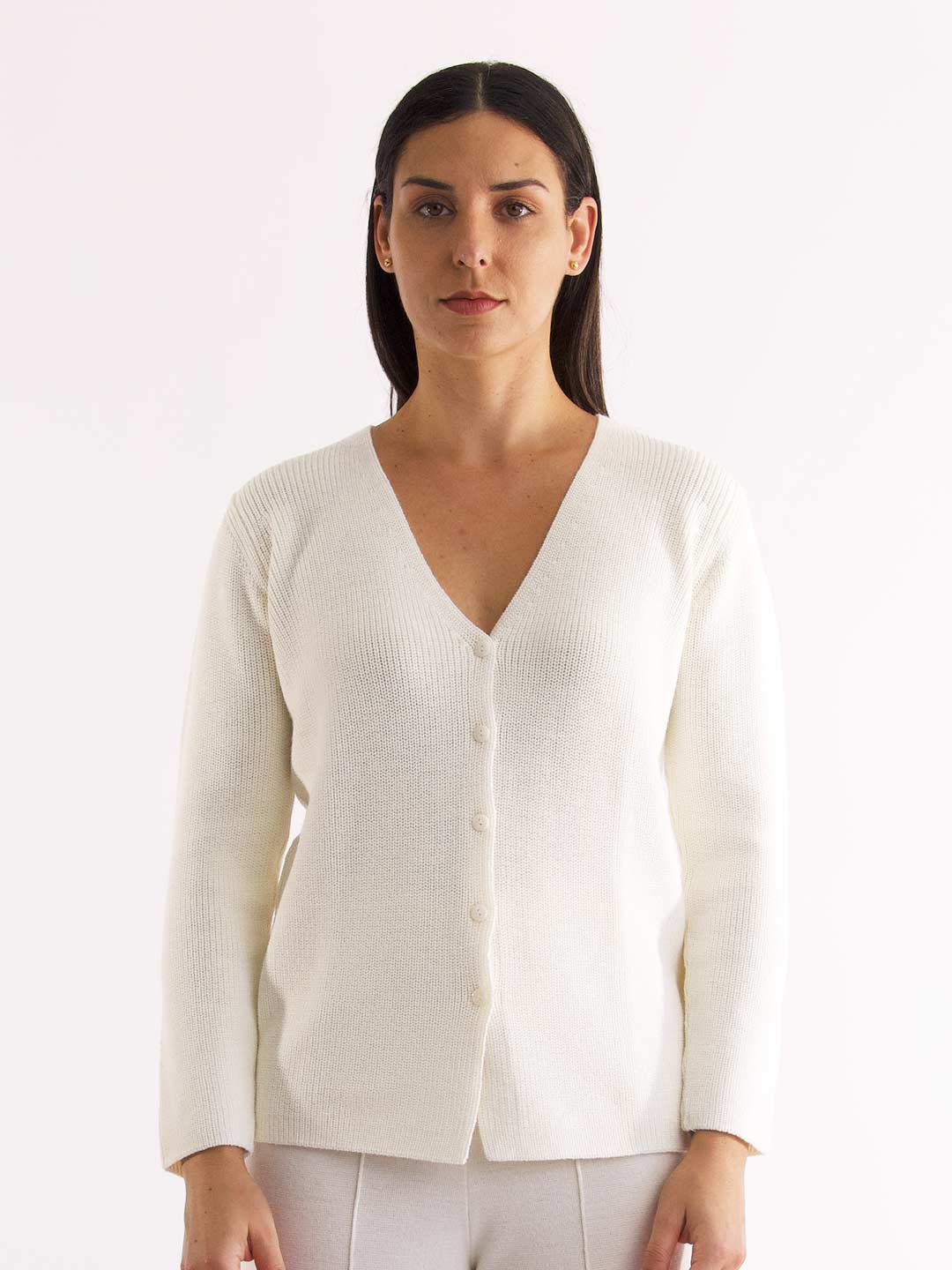 Branco PérolaCasaco com decote V em malha pérola e botões em acrílico. Uma das maiores vantagens da lã merino é a sua hipoalergenicidade e regulação da temperatura. Esta lã é naturalmente resistente a ácaros e outros alérgenos comuns que podem desencadear reações alérgicas na pele. Resistente e durável, um investimento de longo prazo. A modelo mede 174cm e pesa 63kg, veste o tamanho M.