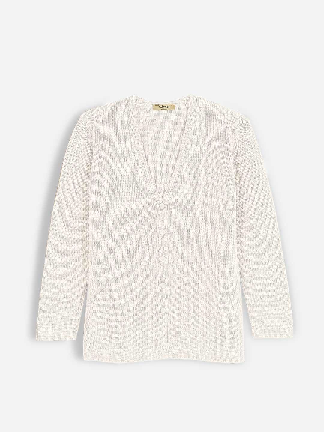 Casaco com Decote em V de Malha Pérola em Lã Merino
