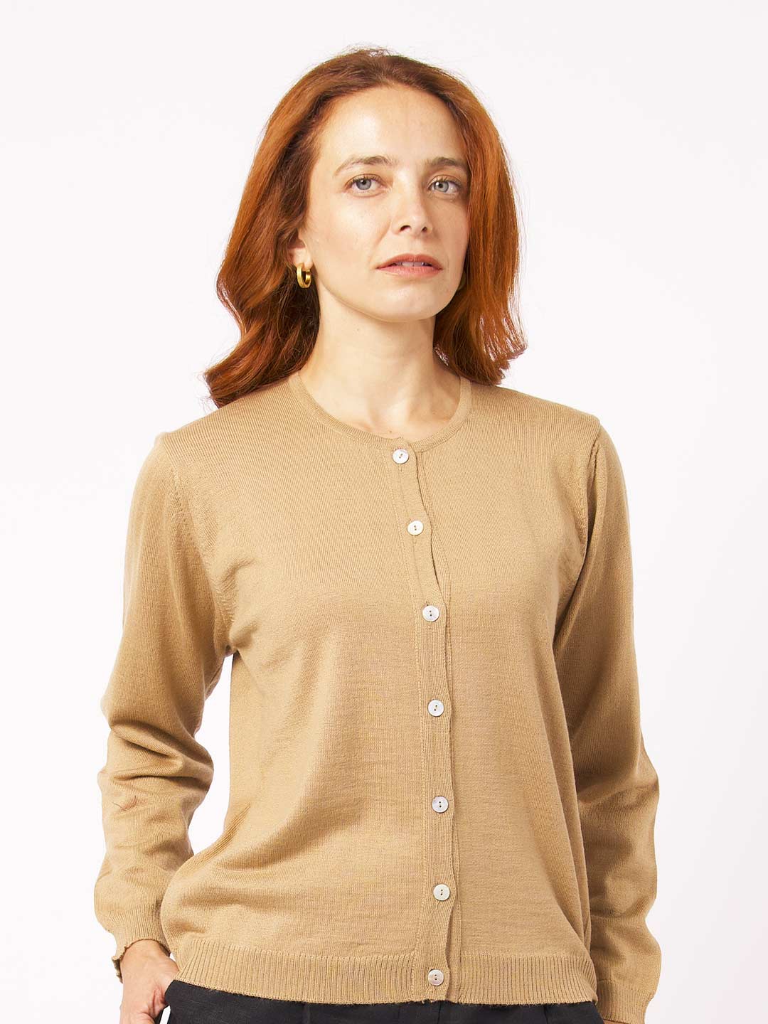 Casaco com decote redondo com botões em madrepérola natural em merino de alta qualidade. Uma das maiores vantagens da lã merino é a sua hipoalergenicidade e regulação da temperatura corporal. Esta lã é naturalmente resistente a ácaros e outros alérgenos comuns que podem desencadear reações alérgicas na pele. Resistente e durável, um investimento de longo prazo. A modelo mede 168cm e pesa 50kg, veste o tamanho S.