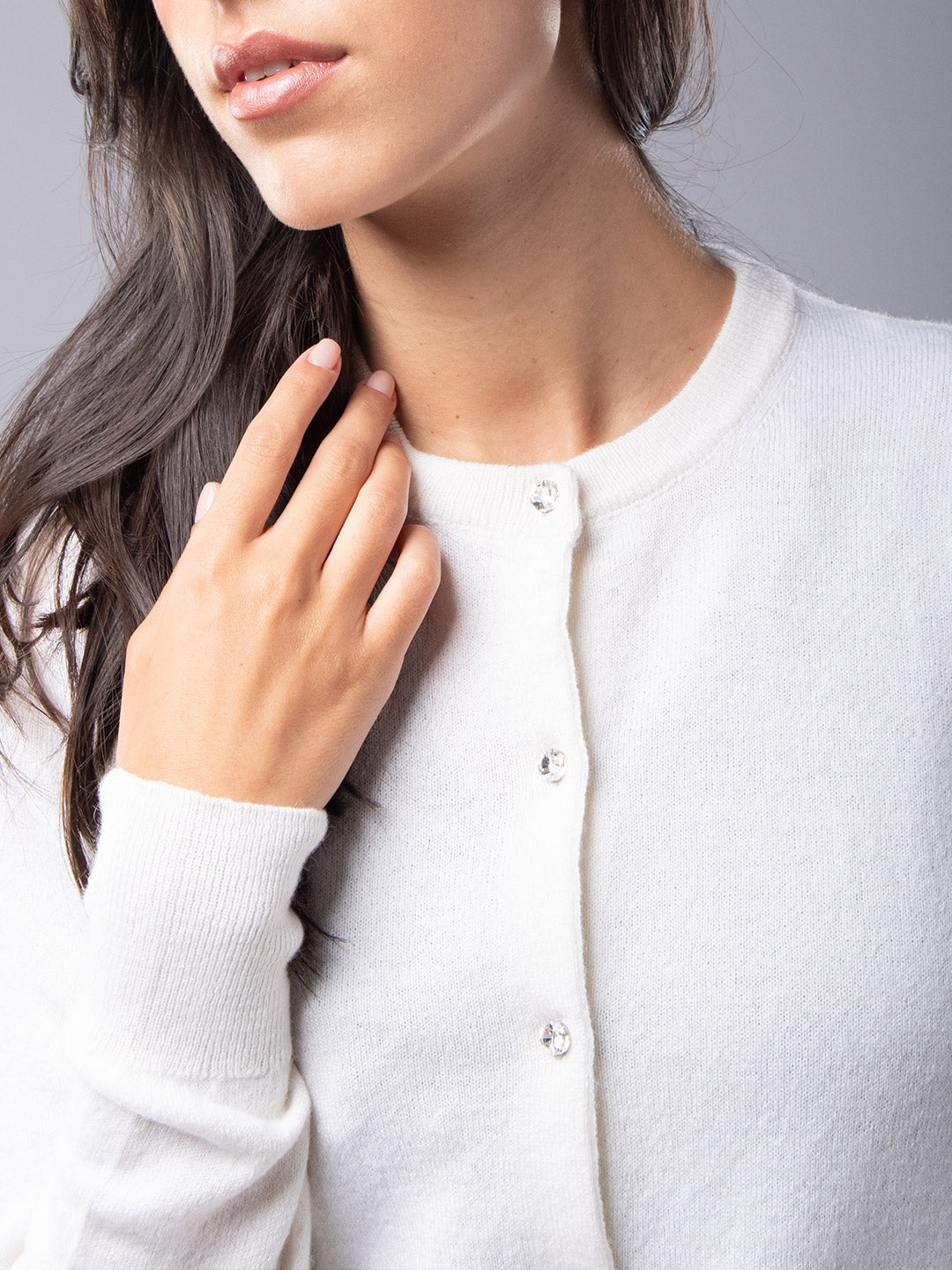 Casaco de Malha em Caxemira com Botões de Cristal Branco Cru