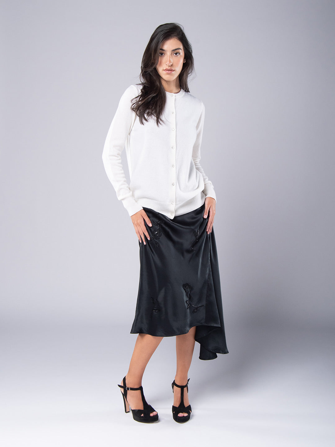 Branco CruApresentamos o nosso casaco de malha em branco cru, um verdadeiro ícone de elegância e requinte. Confeccionado com uma mistura de Caxemira, Seda e Lã, esta peça envolve o corpo com uma suavidade única, proporcionando uma sensação incomparável de bem-estar. Os botões de cristal acrescentam um toque de brilho subtil, conferindo ainda mais sofisticação a este modelo exclusivo. Com um design minimalista e moderno, adapta-se facilmente a visuais casuais ou a ocasiões mais formais elevando o seu guarda-roupa. Tão suave que pode ser usado diretamente sobre a pele, respeitando e cuidando da sua pele com o carinho que merece. A modelo veste o tamanho S, mede 174 cm e pesa 54 kg.