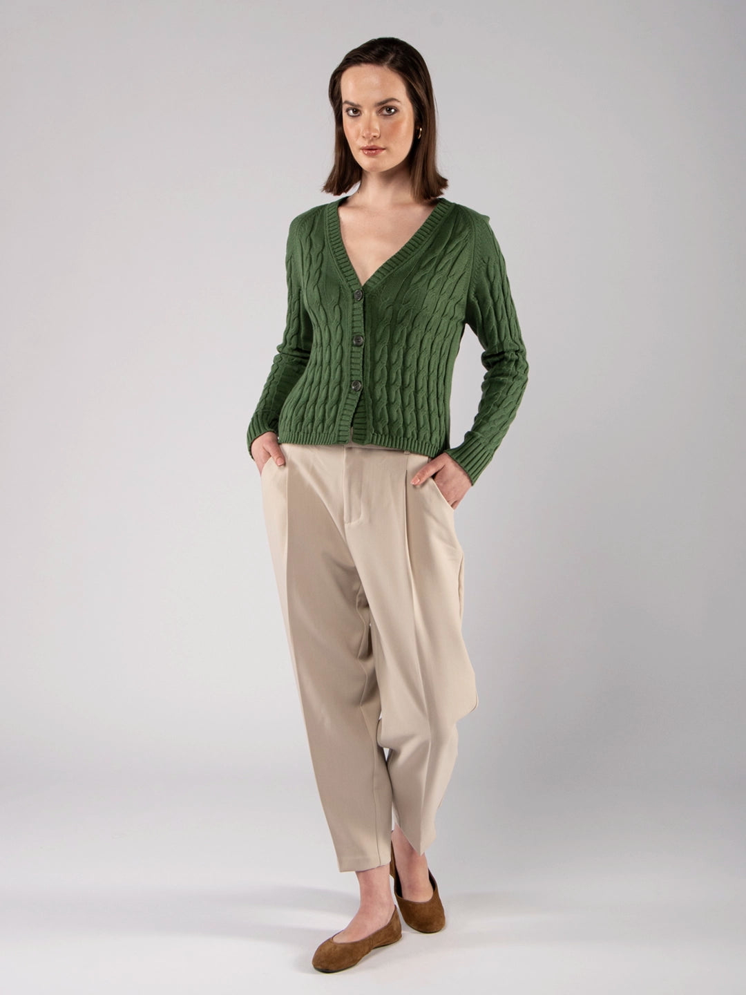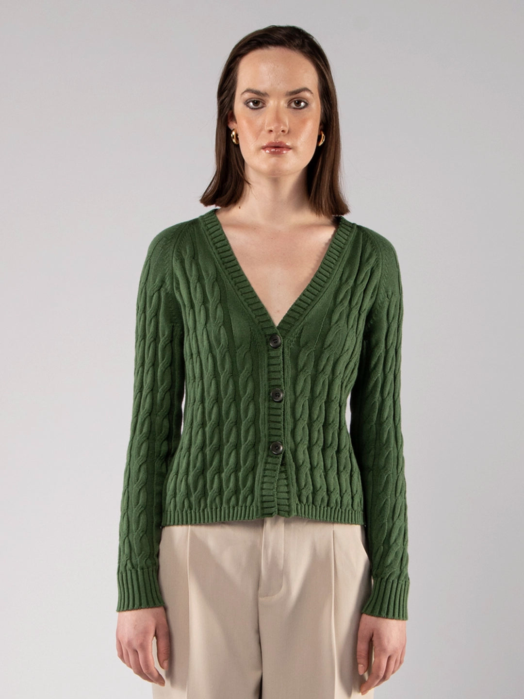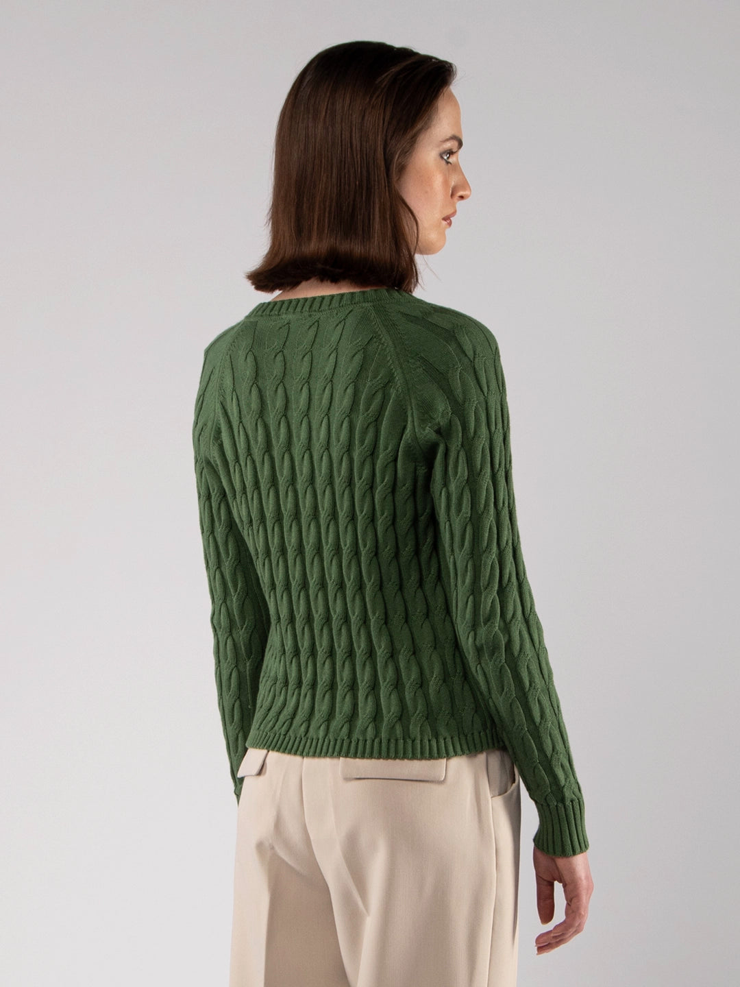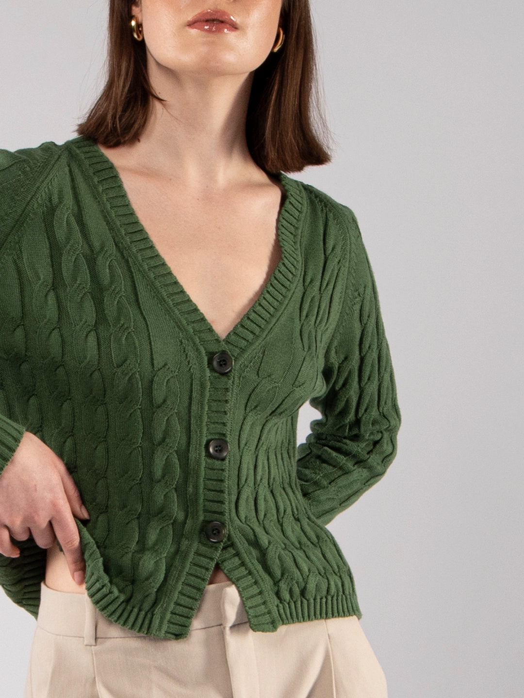 Casaco de Malha Verde Oliva Decote V com Tranças em Algodão Orgânico