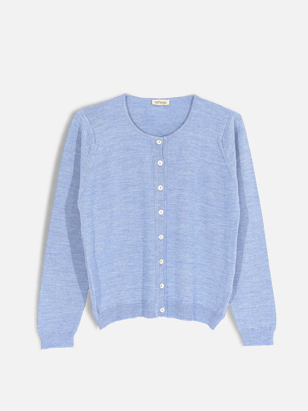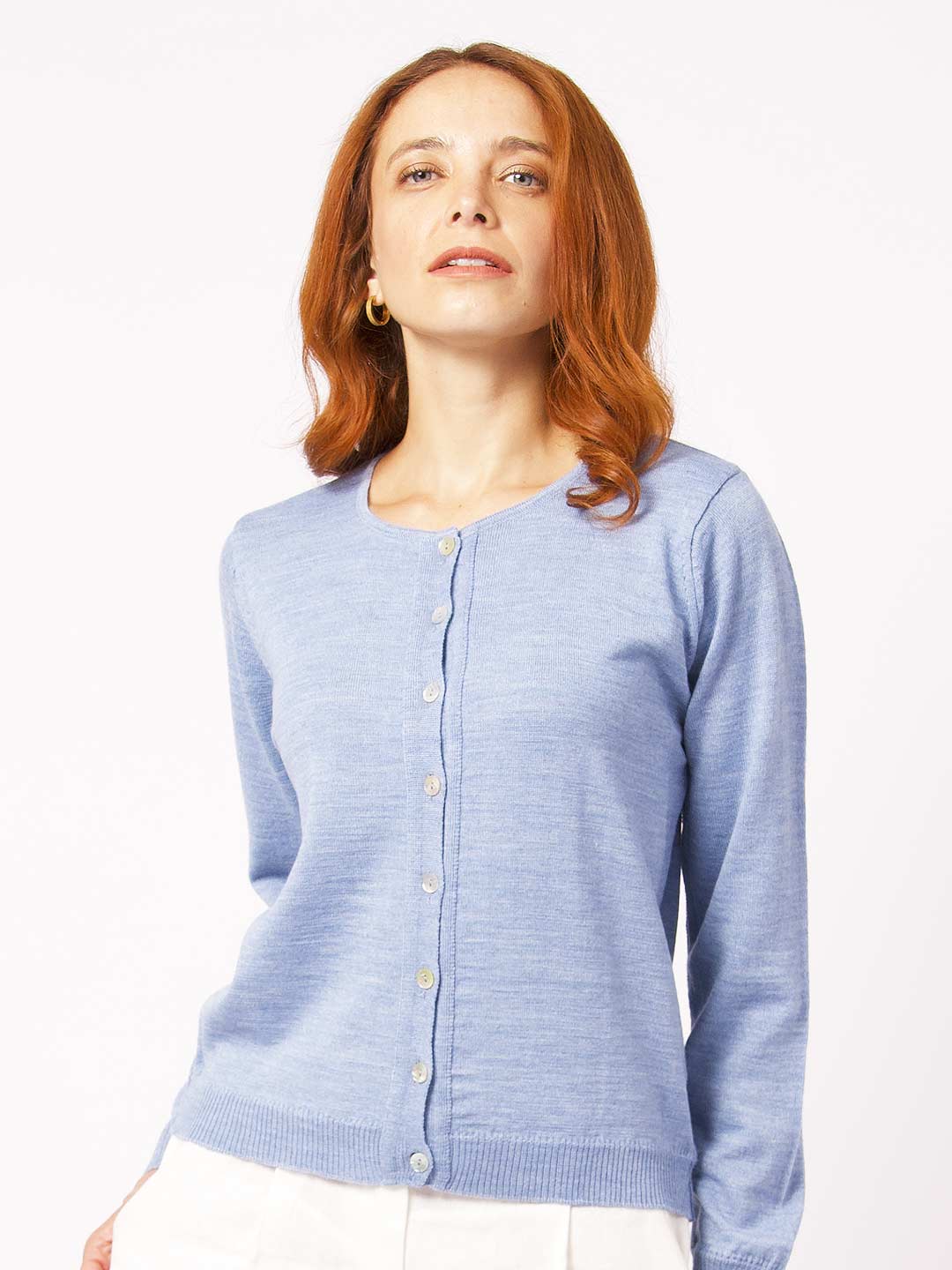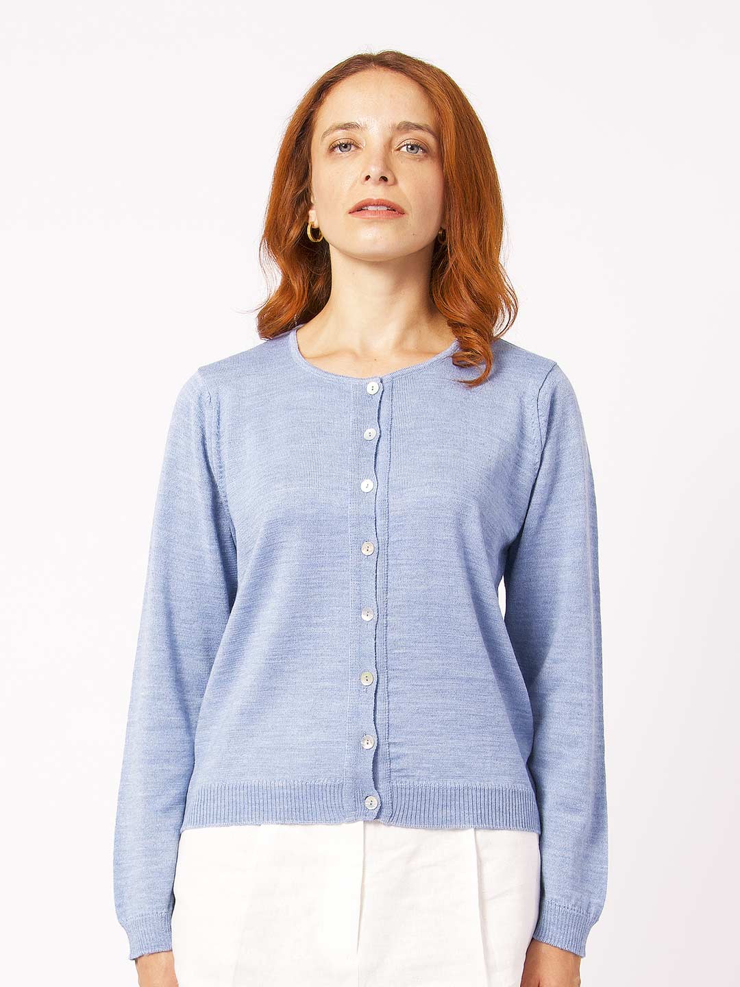 Casaco com decote redondo com botões em madrepérola natural em merino de alta qualidade. Uma das maiores vantagens da lã merino é a sua hipoalergenicidade e regulação da temperatura corporal. Esta lã é naturalmente resistente a ácaros e outros alérgenos comuns que podem desencadear reações alérgicas na pele. Resistente e durável, um investimento de longo prazo. A modelo mede 168cm e pesa 50kg, veste o tamanho S.