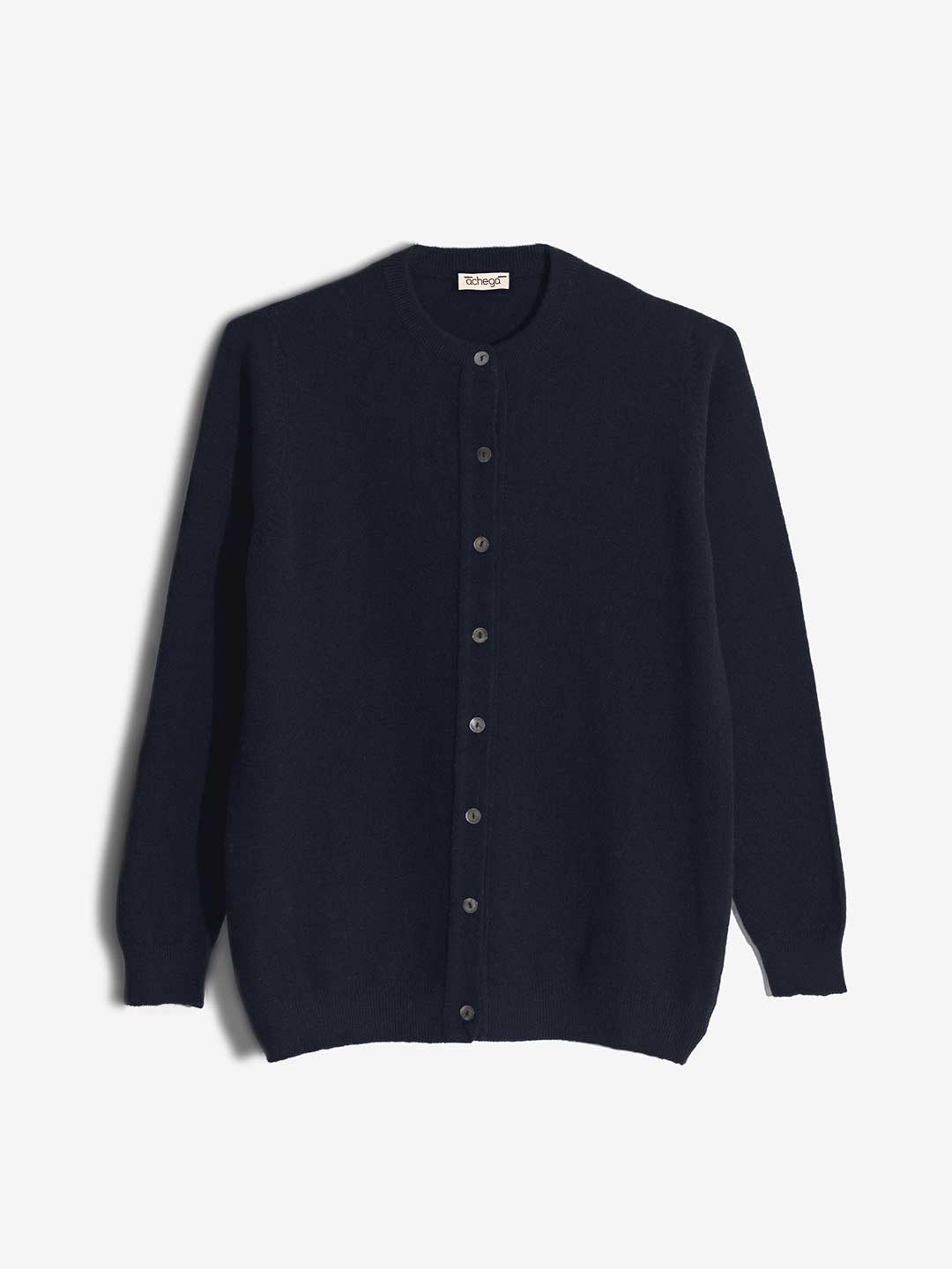 Casaco em malha com decote redondo, botões em madrepérola natural em Lambswool de alta qualidade na cor azul marinho. O Lambswool é uma lã premium colhida a partir das primeiras tosquias de ovelhas. Leve, quente, confortável e macia. Um básico minimal, versátil e de alta qualidade. Uma das características mais notáveis do Lambswool é a sua habilidade de retenção de calor. A modelo mede 174cm e pesa 63kg, veste o tamanho S.
