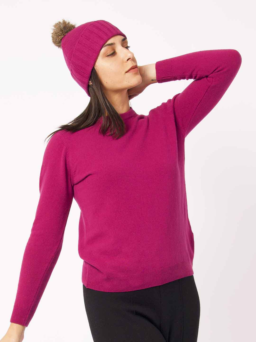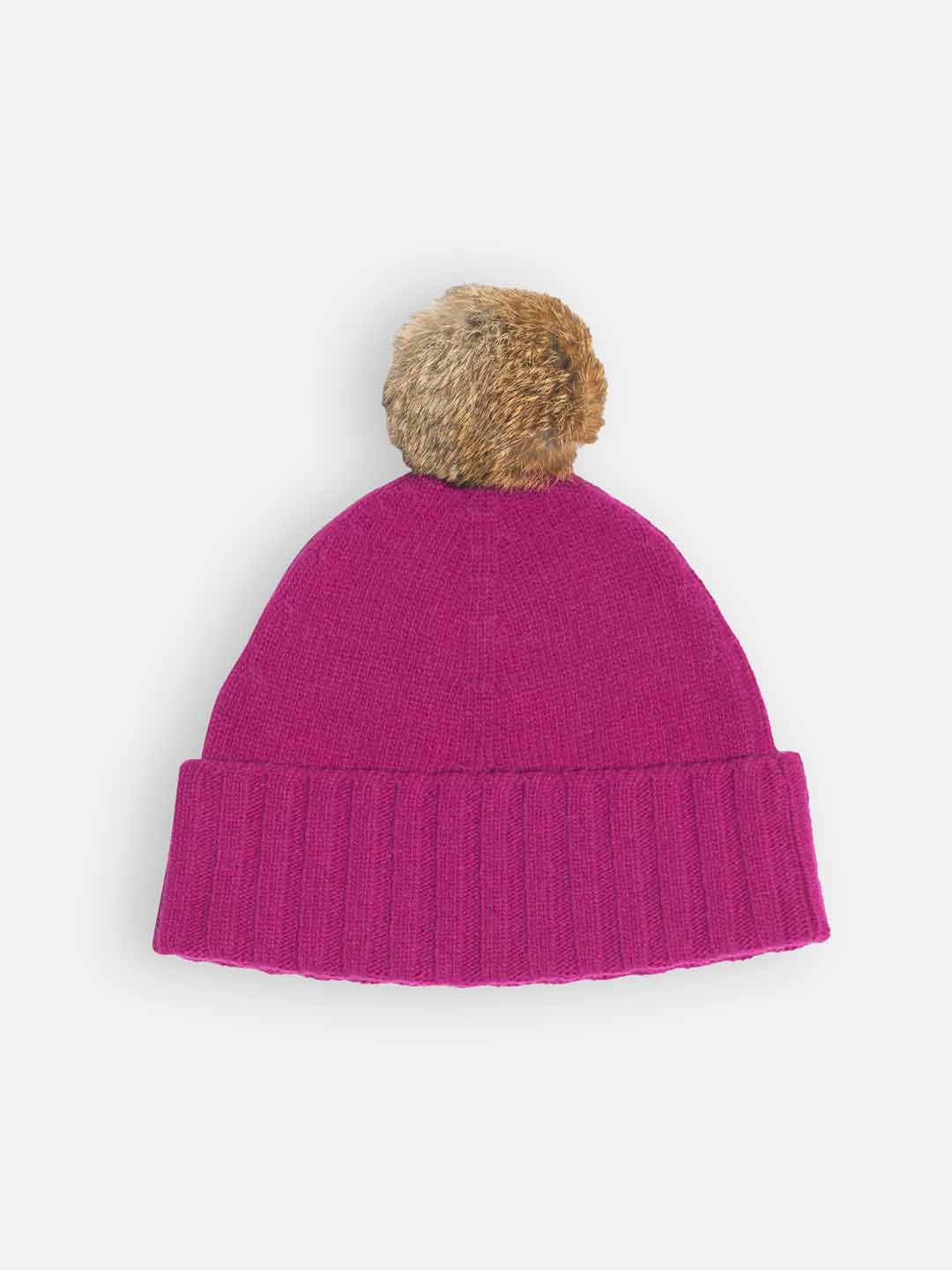 Gorro com pompom em pelo de coelho e lambswool. Coordene este gorro com o nosso cachecol e luvas de lambswool. A alta percentagem de lã de ovelha confere-lhe características que só uma matéria prima natural pode oferecer. Leve, quente, confortável e macio, a escolha perfeita para dias de Inverno ao ar livre. Um acessório premium de alta qualidade. Produzido com fibras italianas este gorro promete longevidade. A modelo está a usar o nosso tamanho único.